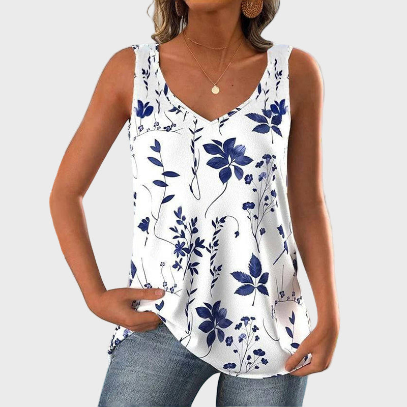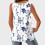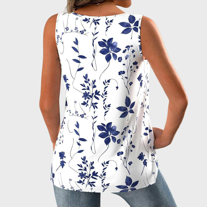 Šviesa & Siuvimas – Насладете се на лятна свежест с този безръкав топ върху бяла основа, украсен с красиви сини цветни шарки.