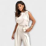 Асиметричен комплект с драматични рамене – скулптурна елегантност с модерно усещане. Асиметричният топ допълва широките панталони, създавайки силует, който е изискан и плавно се движи. Подходящ е за специални поводи или за безпроблемно повдигане на ежедневния стил.
