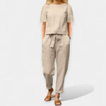 Свободният силует с регулируеми връзки осигурява приятно прилягане, а леките блуза и широките панталони с връзки добавят практичност и елегантност.