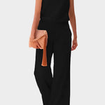 Матова сатенена тъкан: гладка и лека за усещане за лукс и прохлада. Безръкавна блуза: минималистична и елегантна за горещите дни. Панталони с висока талия и широки крачоли осигуряват комфорт и изящност при всеки ход.