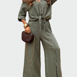 С копчета отпред, колан в талията за подчертване на женствения силует и широки панталони със странични копчета за свобода на движение и стил.