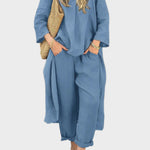 Stilingas ir Patogus Komplektas е стилен ленен комплект в тъмносиньо, който съчетава проста елегантност и ежедневна практичност. Подходящ за летни приключения, той дава свобода на движение и леко излъчване на стил. Ленената материя е прохладна, дишаща и приятелска към кожата.