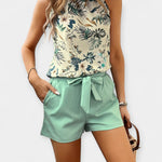 Tropinio Rašto Komplektas su Halteriu – Обновете гардероба си с този ярък и освежаващ комплект, идеален за топлите пролетни и летни дни. Halter горнището предлага модерен крой, който подчертава раменете, а съчетаните шорти с колан осигуряват стил и комфорт за ежедневни излети. Тропичният принт придава освежаващ летен дух и е идеален за разходки, ваканции или спокойно прекарване със стил.