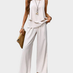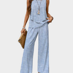 Vasaros Komplektas su Rankovių Mėgstinu ir Platėjančiomis Kelnėmis su Raštais – освежаващ и стилен летен комплект, който съчетава елегантен безръкав пуловер с широки панталони с мотиви на листа.