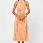 Franceska | Maxi Suknelė – елегантна и лека рокля с впечатляваща връзка около врата и романтично настроение. Ремъкът в средата подчертава силуета, а органзена пола с плисирани детайли придава движение и изящество. Подходяща е за сватби, летни събития или стилни партита.