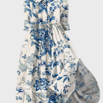 Gėlėtas Porceliano Suknelė – Тази зашеметяваща дълга рокля със светъл бял фон и син цветен принт излъчва свежест и елегантност. Нейният лек дизайн създава романтично настроение, а поясът в талията подчертава силуета естествено и женствено. Подходяща за пролетни и летни поводи.