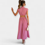 Išskirtinė Elegantiška Suknelė – Перфектна рокля за ежедневен комфорт и елегантност. Тя балансира ежедневния стил с изискан акцент и ласкаво подчертава всички фигури с уникална лекота. Роклята има стояща яка и къси ръкави за изящен вид, а талията подчертава силуета без да стяга; задният цип допринася за чист и елегантен силует, подходяща за носене от сутрин до вечер.