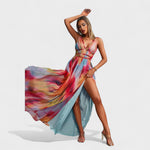 Karina - Elegantiška ir Vėsiai Suknelė – луксозна лятна рокля за стил под слънцето. С гладък силует и ярък акварелен принт, роклята подчертава женствеността и комфорта. Идеална за морски партита, тропически ваканции и всеки момент, който изисква изискана елегантност.