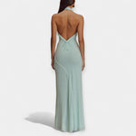 Макси рокля с яка и връзка за шията – впечатляваща комбинация от сексапил и елегантност. Проектирана да приляга по тялото и да подчертае фигурата чрез връзка за шията и драпирано деколте, откритият гръб добавя женствен чар. Шевовете по гърба оформят силуета, правейки я идеална за сватби, вечерни поводи и официални събития.