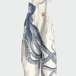 Moteriškas platus džinsinis kombinezonas – Дамски широк деним гащеризон „Octopus“ от плат, който съчетава изкуство и стил в забележително изделие. На естествен бял фон тъмносиният осемкрак мотив изпъква с детайли, създавайки морска аура, която привлича погледи. Ремъкът на раменете осигурява комфорт и регулируемост, подходящ за ежедневна употреба и за артистични изяви.