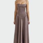 Satininis Maxi Suknelė su Plonomis Petnešomis – Елегантна и минималистична сатенена рокля, която излъчва вневременна изисканост. С тънки презрамки и дискретни шевове, които подчертават талията, тя създава женствен и изискан силует. Идеална за вечерни изяви, сватби и специални поводи.