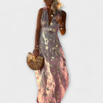 Tatiana - Sklandus Suknelė su V Formos Iškirpte – Елегантна рокля с плавен силует и V-образно деколте, която съчетава комфорт и стил за всяка повода. Летният привкус се допълва от хармонична синьо-жълта палитра, напомняща за слънчеви дни и природна красота. Деликатни бляскави пайети придават фин блясък за специални моменти.