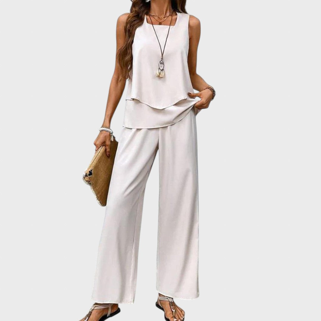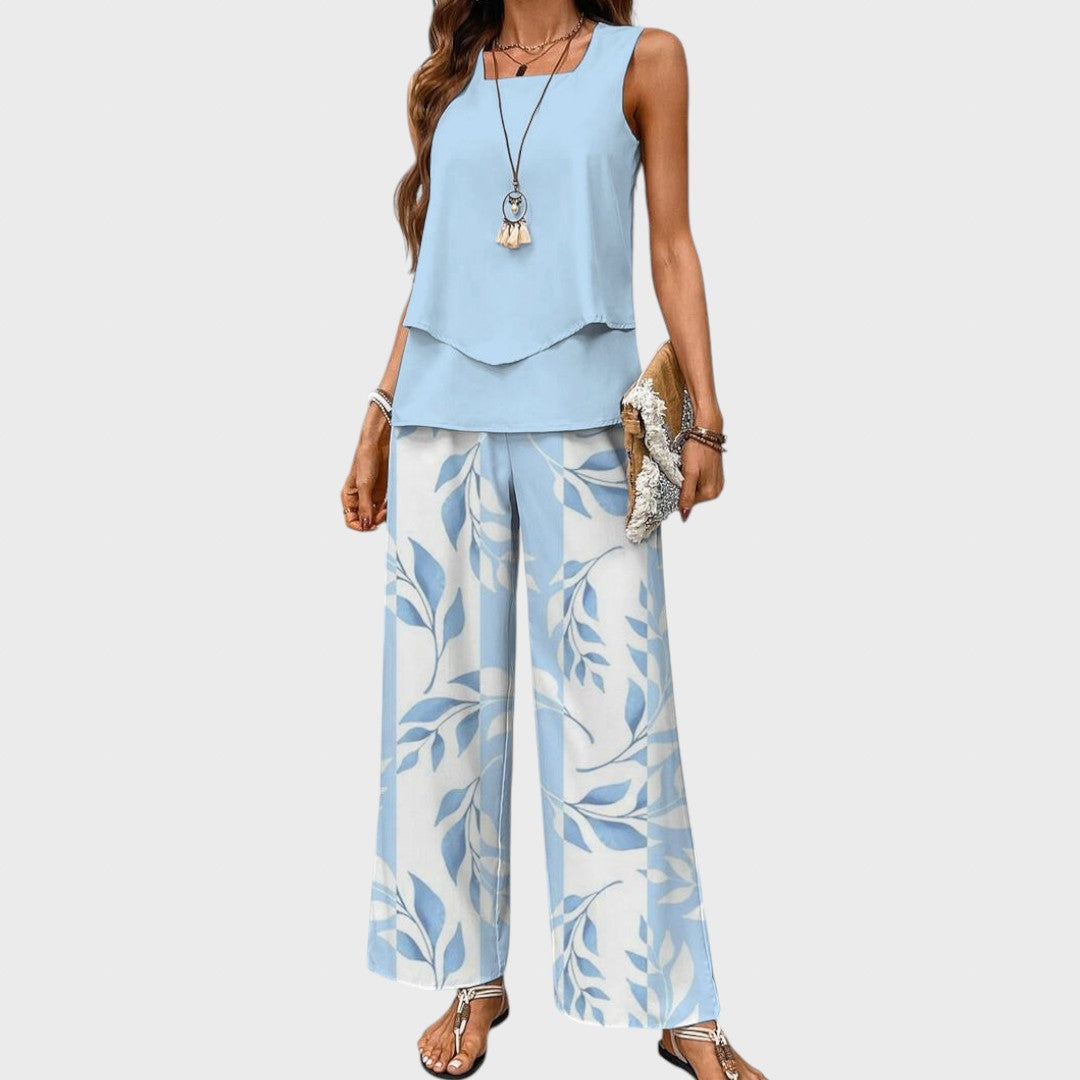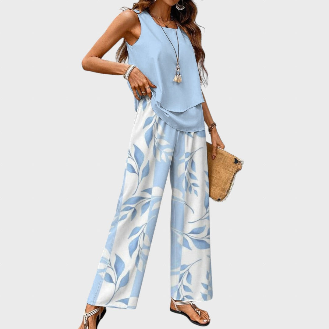 Белина е създаденa за жени, които обичат елегантността без усилие. Този двукомпонентен летен комплект включва ефирен наслоен топ и широк панталон с висока талия – съчетание от комфорт, стил и женственост. Идеален за слънчеви дни, пътувания или непринудени срещи с приятели.
