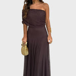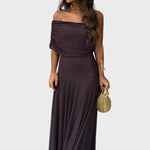 • Женствен силует – отворените рамене и меките драперии подчертават деликатната елегантност.
