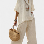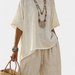 Viduržemio jūros regiono baltiniai – чиста простота с естествена елегантност. Daisy комплектът се откроява със свободен и монохромен силует, идеален за тези, които търсят комфорт и чист стил. Леката материя от бамбук-лен следва всяко движение с освежаваща лекота и елегантна свобода, перфектни за морски бягства, спокойни дни и естествен стил.