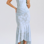 Kiara | Suknelė е впечатляваща рокля с прилегнала линия и релефен модел, който елегантно обгръща тялото. Извитото бюстие осигурява опора и женствен силует, а фините плисирани детайли по талията подчертават контурите. Асиметричната пола добавя движение и лукс към всеки стил. Идеална за официални вечерни поводи.