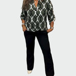Marškiniai su grafiniu piešiniu – Дамски ежедневни ризи с модерен геометричен принт в нюанси хаки и бяло.