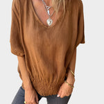 Удобни летни тениски – Стилни и изключително удобни за ежедневието в естествено кафяв цвят. Свободният силует и V-образното деколте подчертават линията на деколтето без прекалено акцентиране, подходящи за ежедневни или вечерни поводи. Текстурата е мека и комфортна за целия ден, а еластичната лента в талията създава елегантен силует без ограничения.