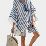 Viduržemio jūros regiono baltinių – морска свежест и безупречен летен чар. Nancy комплектът включва oversized ризи с райета в синьо и бяло, комбинирани с елегантни шорти за лесен, стилен вид. Декоративните ресни на деколтето и текстилното оформление добавят характер и лекота.
