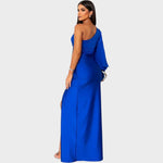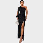 Rasa – Елегантна дълга рокля с едно рамо – стилна и модерна вечерна рокля за специални поводи. Асиметричната конструкция, едно рамо и впечатляващ акцент в талията подчертават женствения силует, докато дълбокото деколте добавя нотка на елегантност и самоувереност. Перфектният избор за гала вечеря, сватбени тържества и важни събития, на които искате да сияете и оставите незабравимо впечатление.