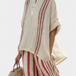 Viduržemio jūros regiono baltinių – Отпуснете се със стил и комфорт през топлите дни. Daisy костюмът съчетава просторна риза с V-образно деколте и широки панталони с вертикални ленти, които издължават силуета.